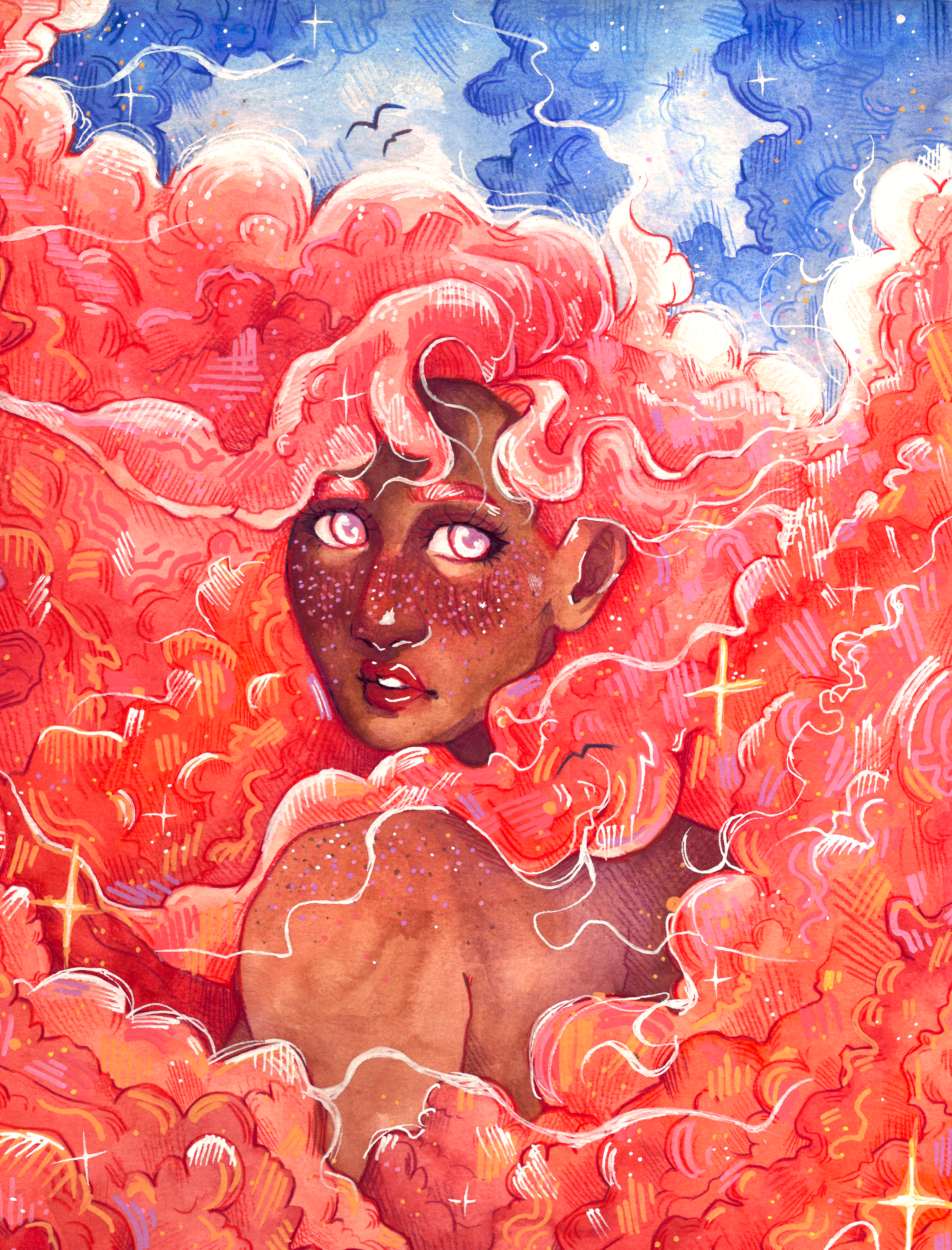 This painting depicts a beautiful Goddess in the sky with her hair made of clouds. Birds fly around her, showing the scale of this great Goddess. The piece was named after Hemera, the Greek Primordial Goddess of Day.